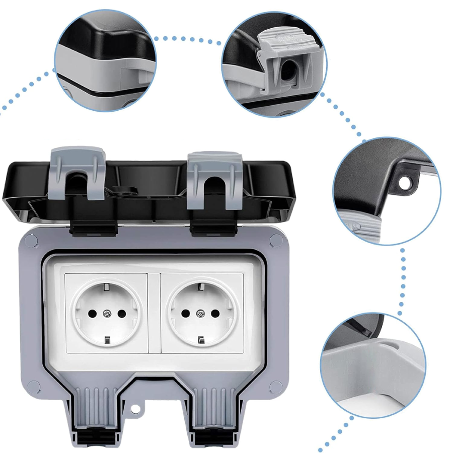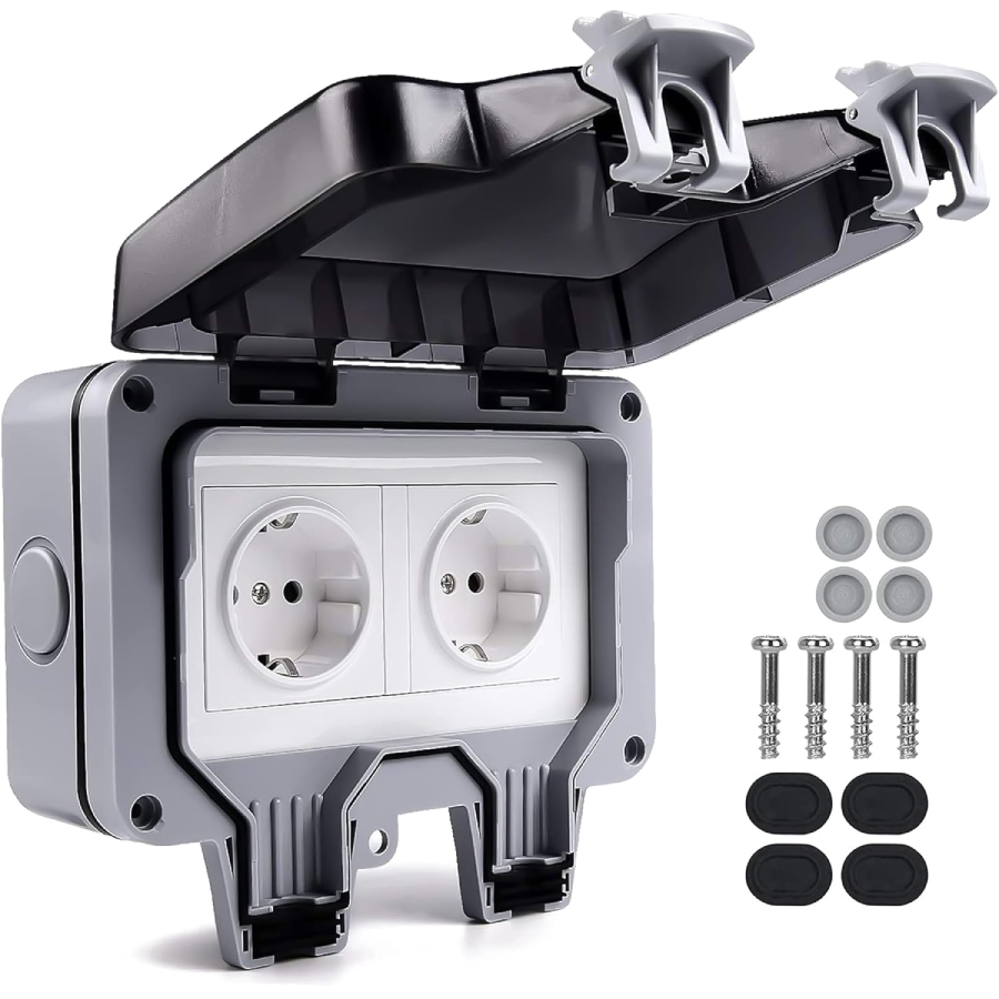 Влагозащищённая двойная розетка предназначена для безопасного подключения электроприборов в условиях улицы и повышенной влажности. Герметичный корпус и защитная крышка обеспечивают защиту от воды, пыли и внешних воздействий, что делает её подходящей для длительного использования на открытом воздухе.